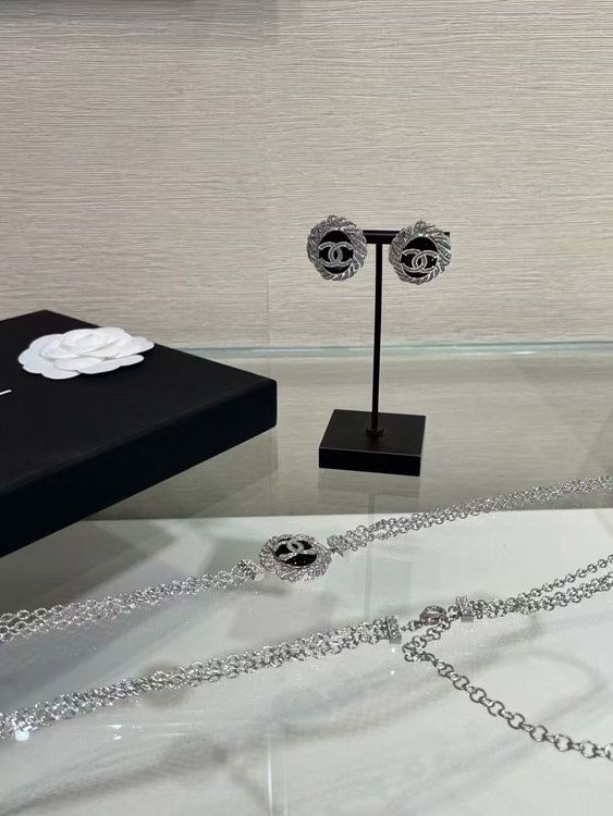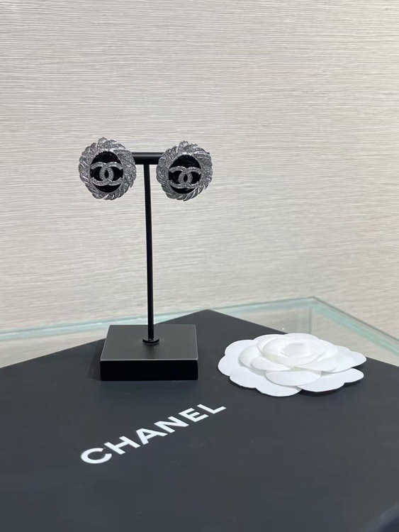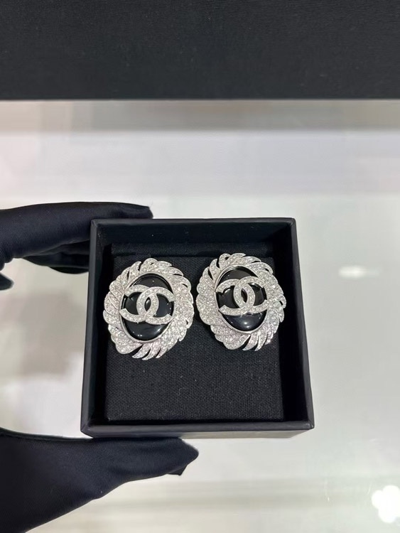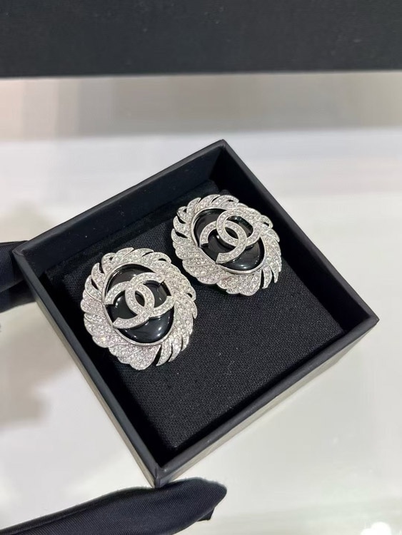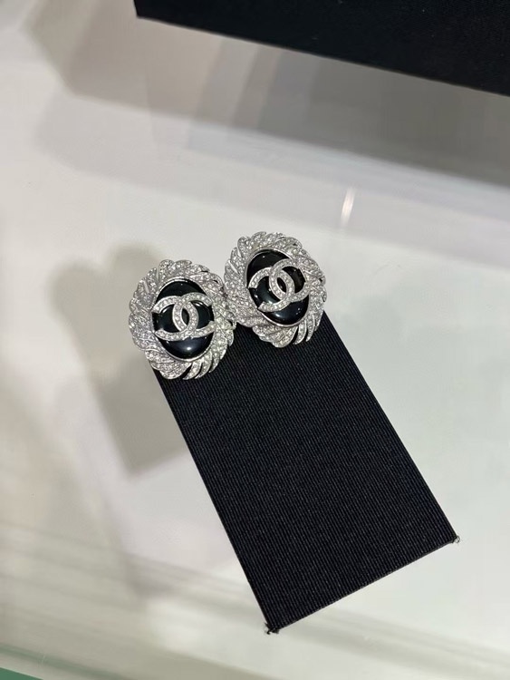 Celine schwarze Oval Knopf Silber Voll Diamant Doppel C Ohrringe-3900