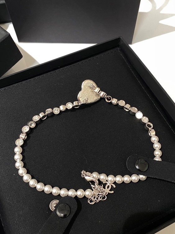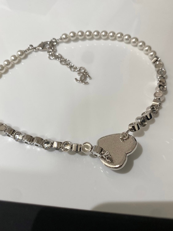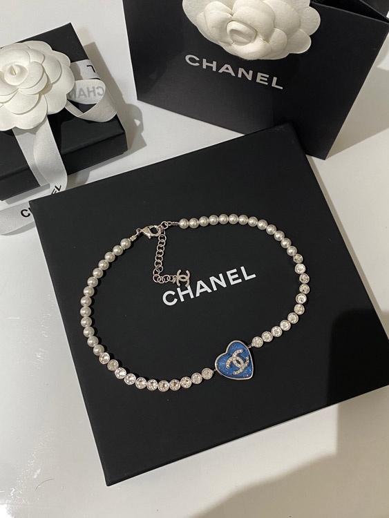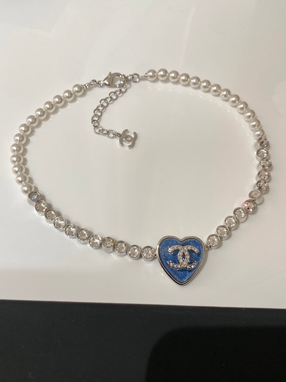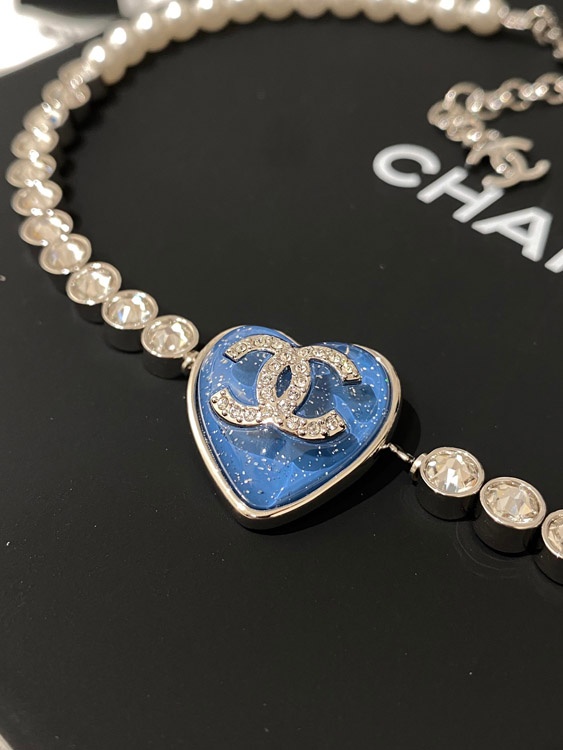 Chanel blaues Herz Perle Strass Halskette-3594