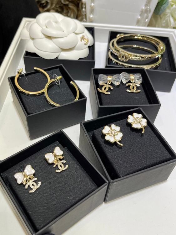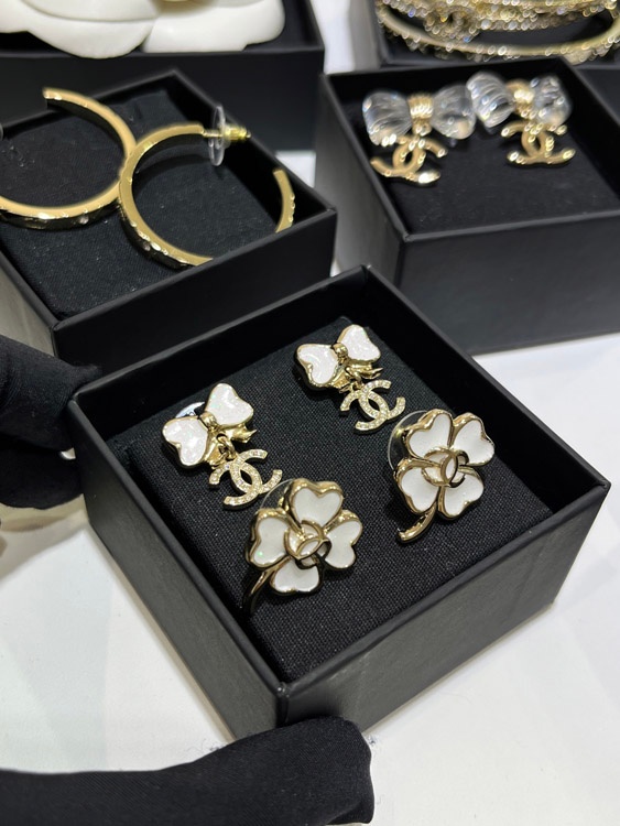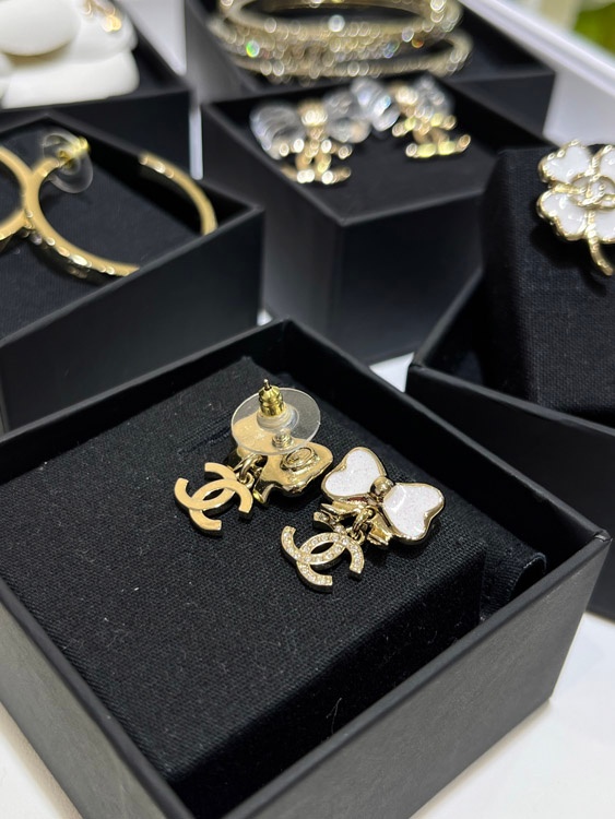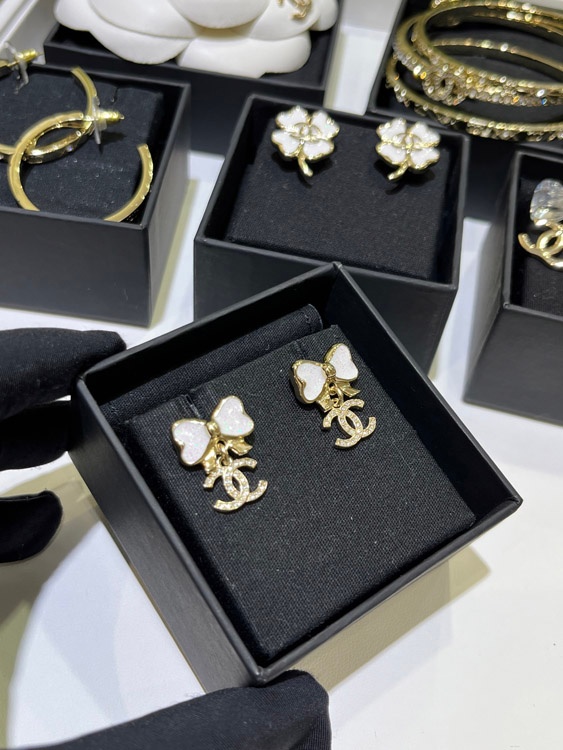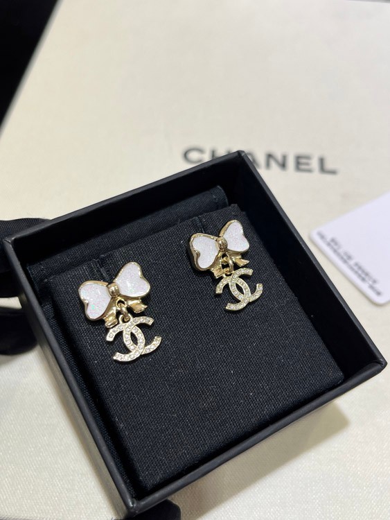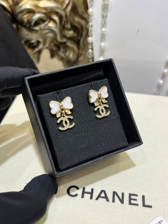 Chanel weißes Glitzer Emaille Bogen Gold Voll Diamant Doppel C Ohrringe-3745